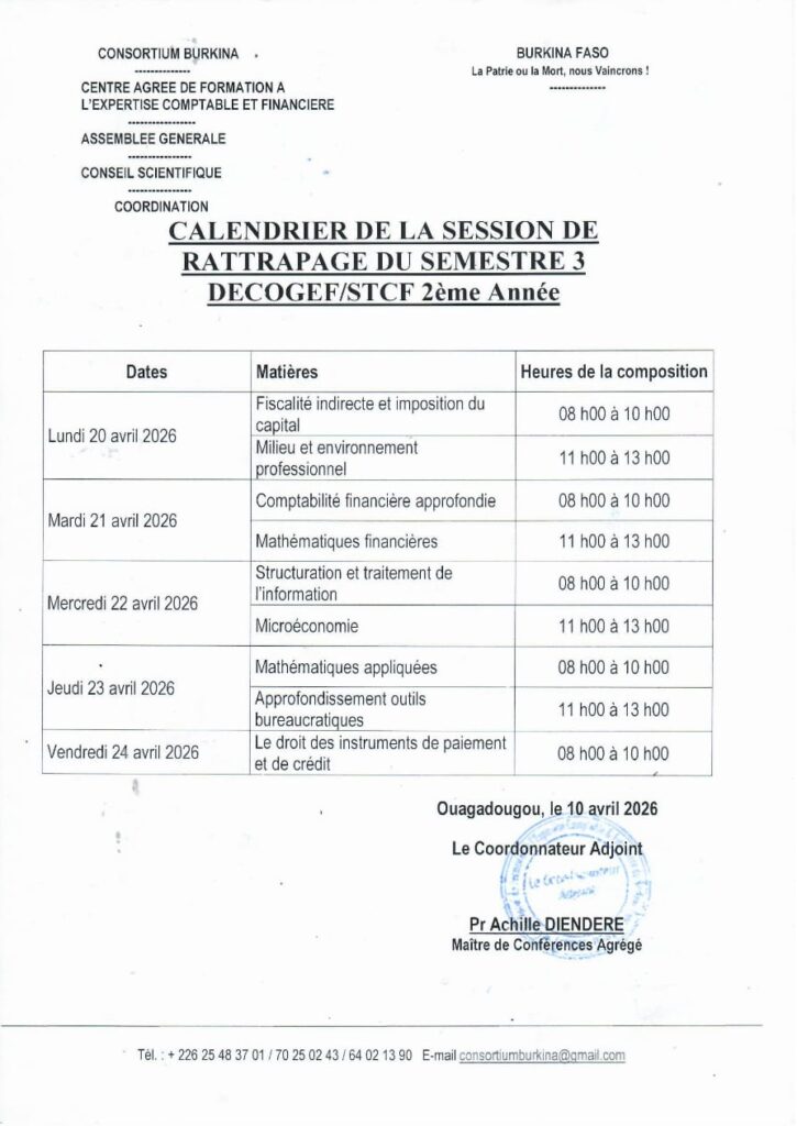 Calendrier de la session de rattrapage du semestre 3 DECOGEF/STCF 2ème année. Laisser un commentaire / Uncategorized / Par Congo.Salamata