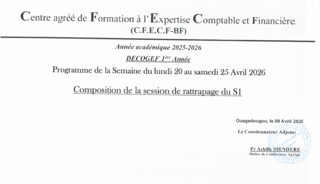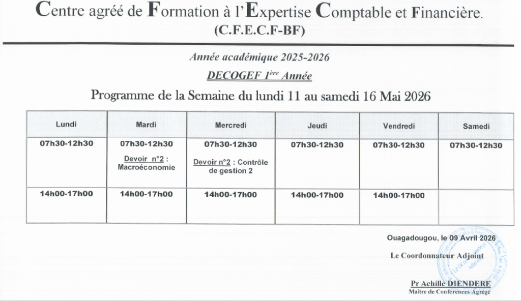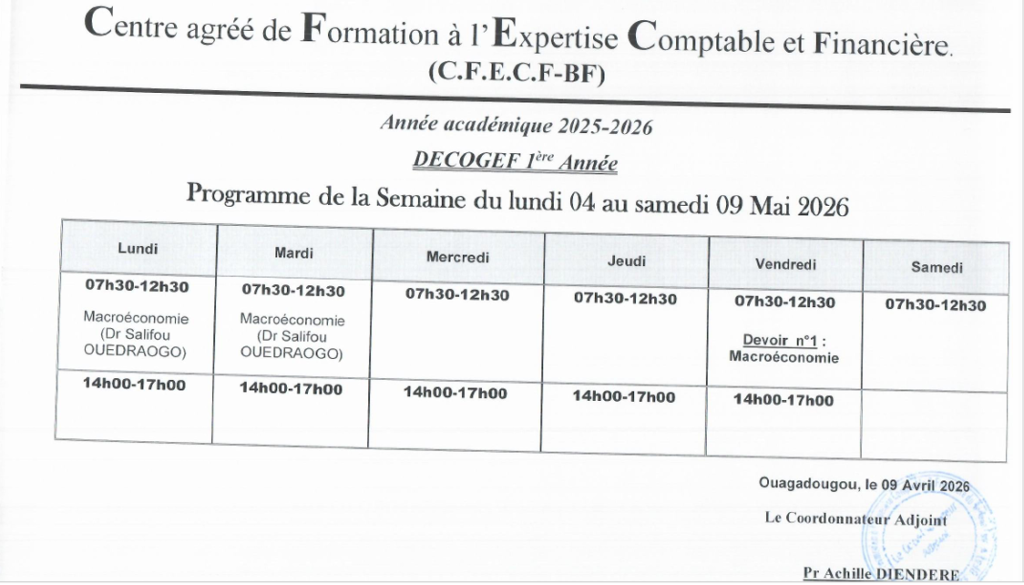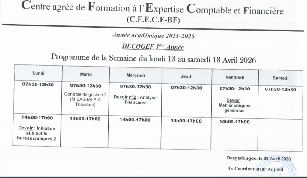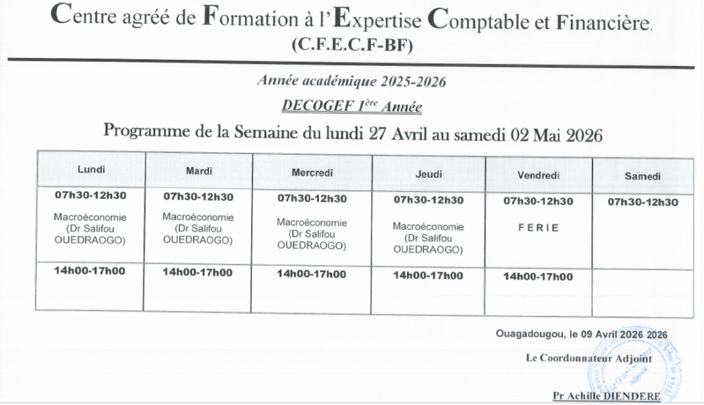 Emploi du temps DECOGEF 1ère année du 13 Avril au 16 mai 2026. Laisser un commentaire / Uncategorized / Par Congo.Salamata