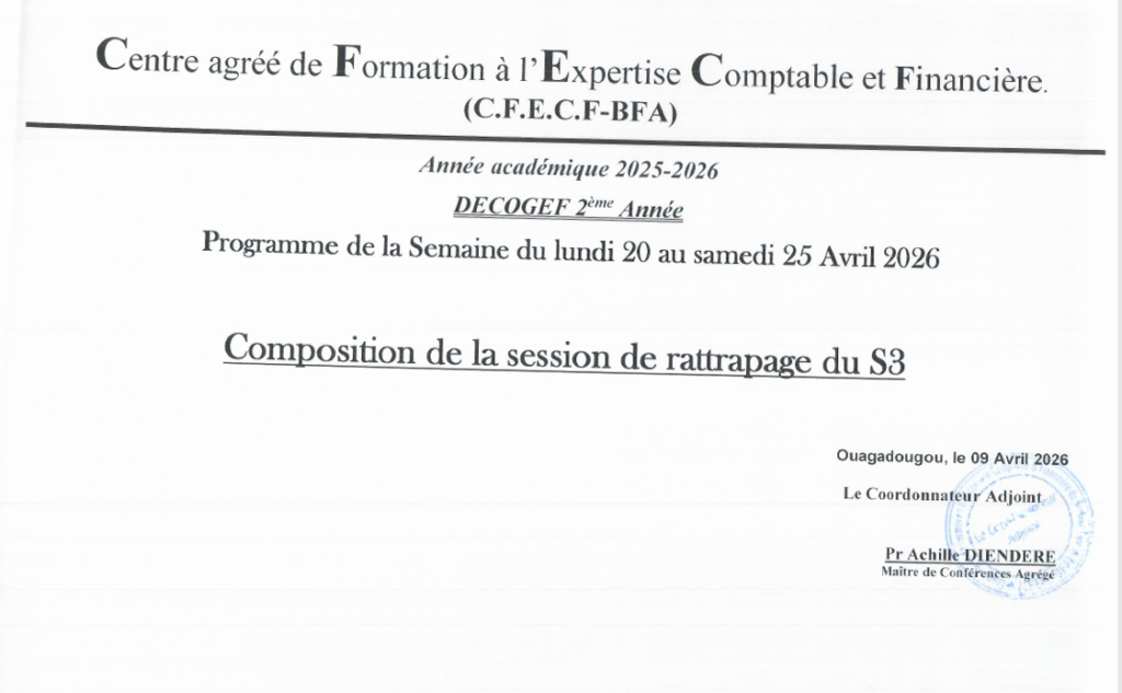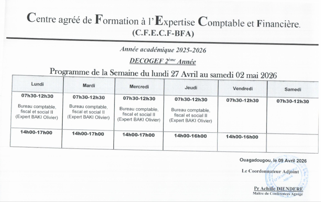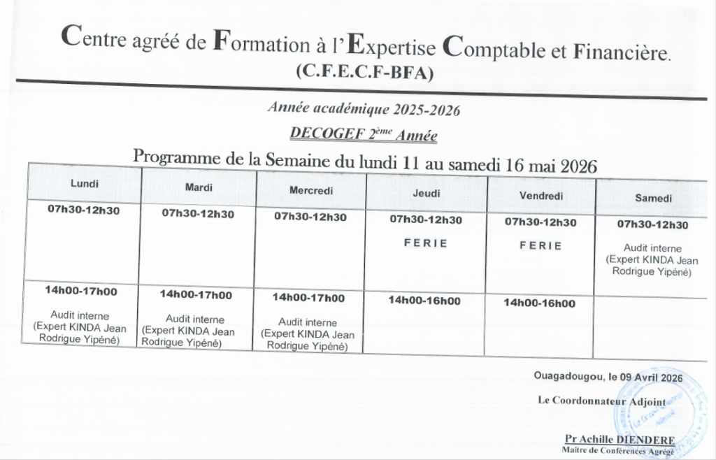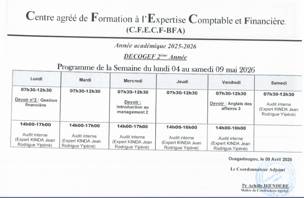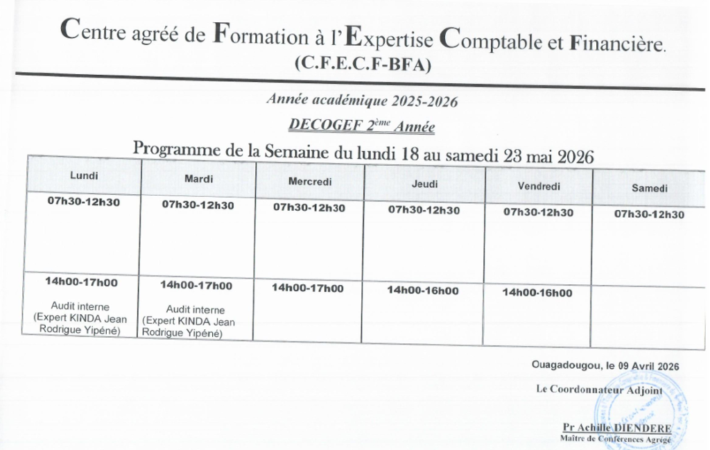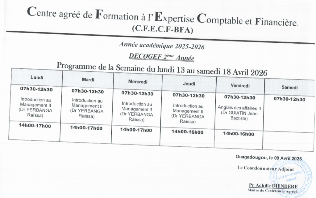 Emploi du temps DECOGEF 2ème année du 13 Avril au 23 mai 2026. Laisser un commentaire / Uncategorized / Par Congo.Salamata