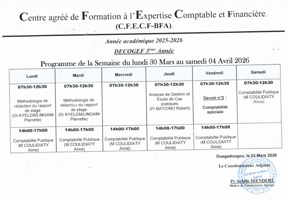 Emploi du temps DECOGEF 3ème année du 09 mars au 12 avril 2026 Laisser un commentaire / Uncategorized / Par Congo.Salamata